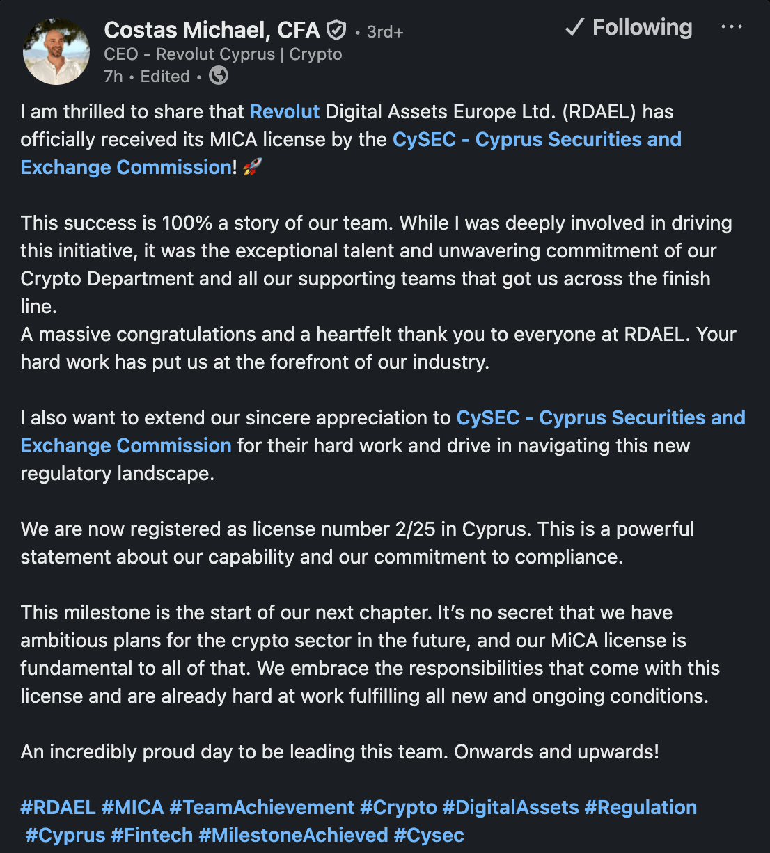 Viszont ma Linkedinen a Revolut Digital Assets Europe vezérigazgatója, Costas Michael közzétett egy posztot, amelyben jó híreket osztott meg.