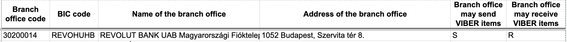 Ebbe a VIBER rendszerbe is bekerült a Revolut, ez is megtalálható az MNB oldalán a hitelesítő táblában. Így a belföldi forint átutalások másodperceken belül oda-vissza megtörténnek a Revolut számláján is: