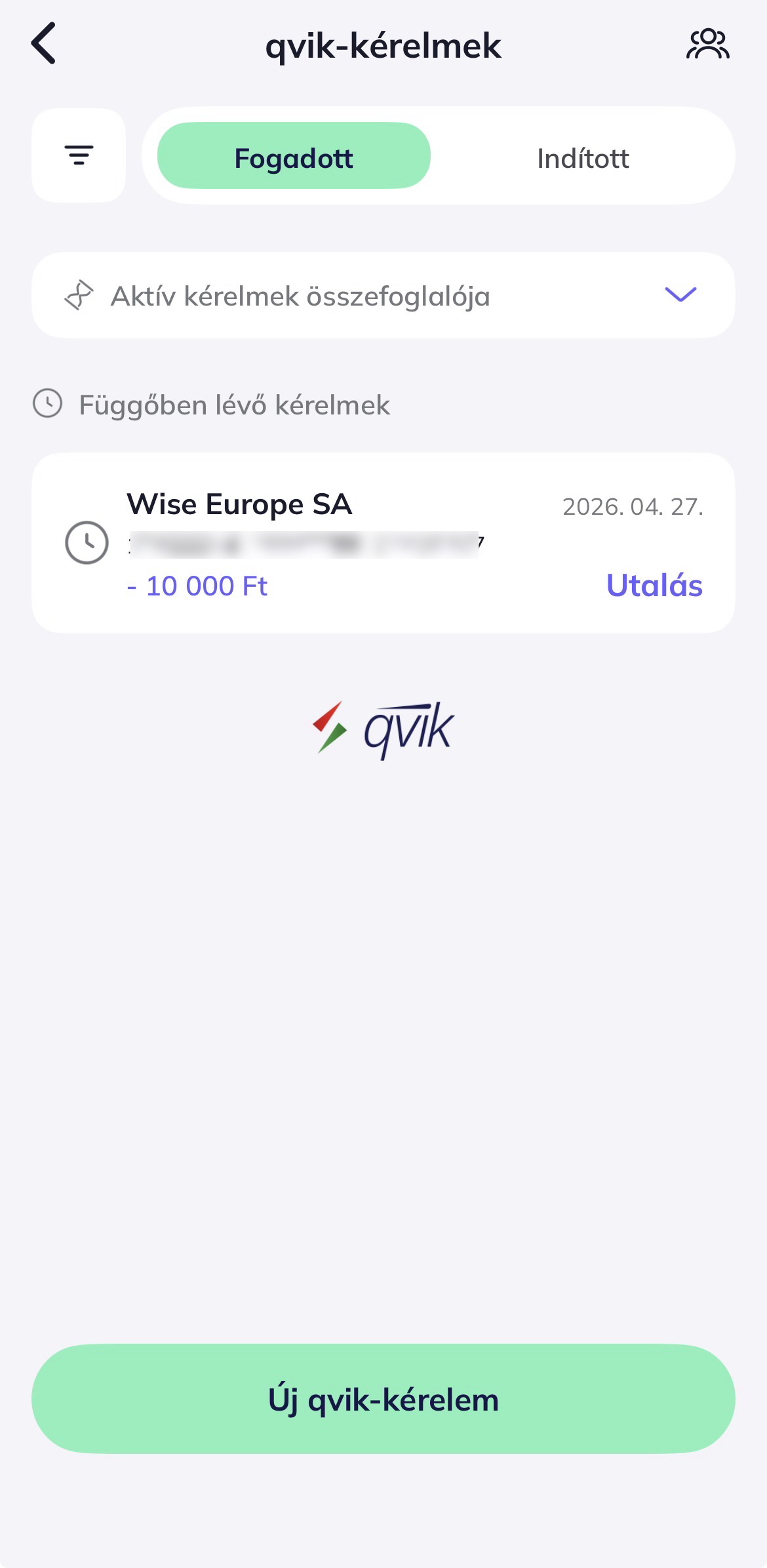 A bank appot megnyitva láthatjuk azt, hogy qvik fizetési kérelem érkezett, amit pár gombnyomással tudjuk is rendezni: