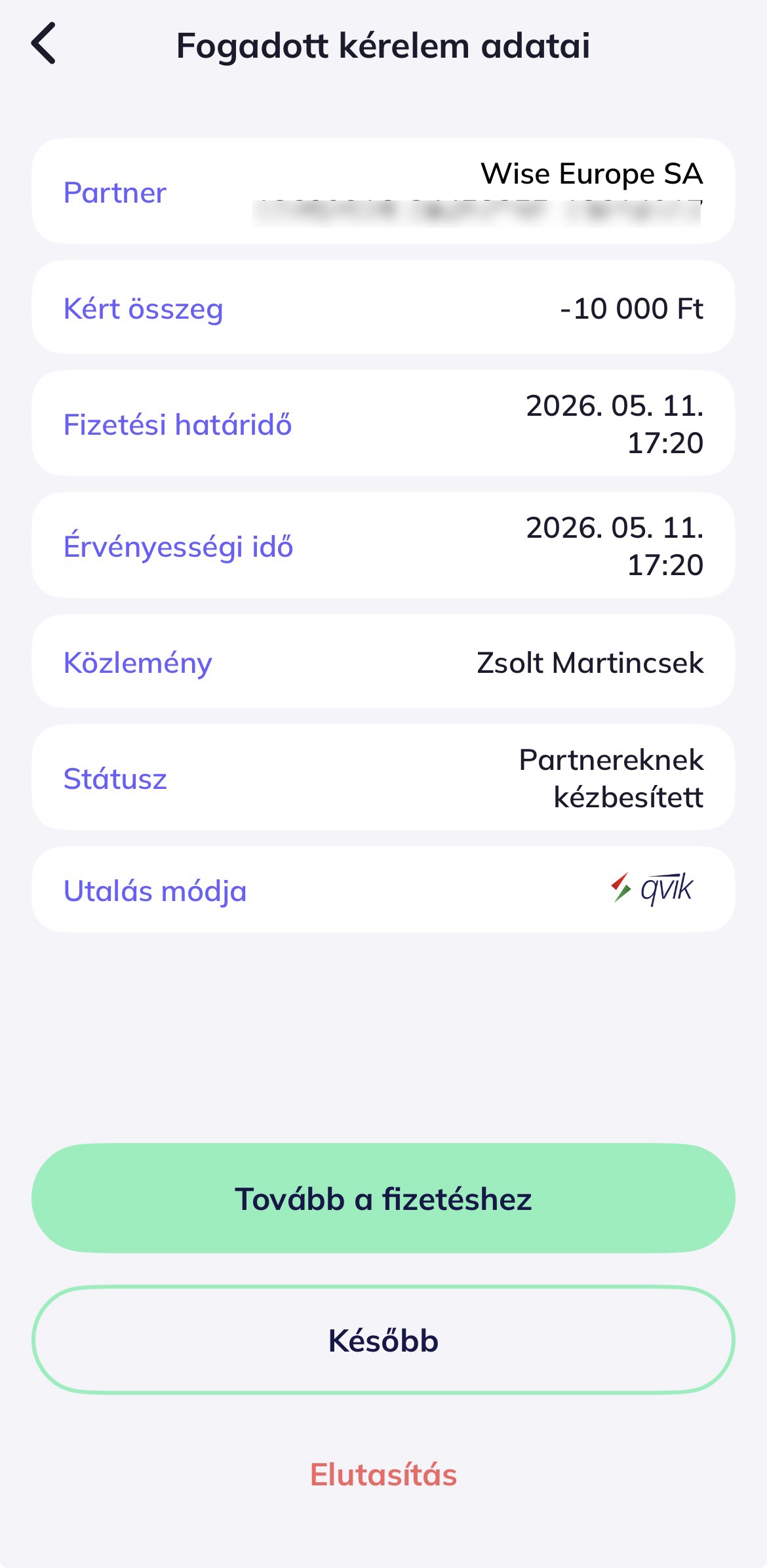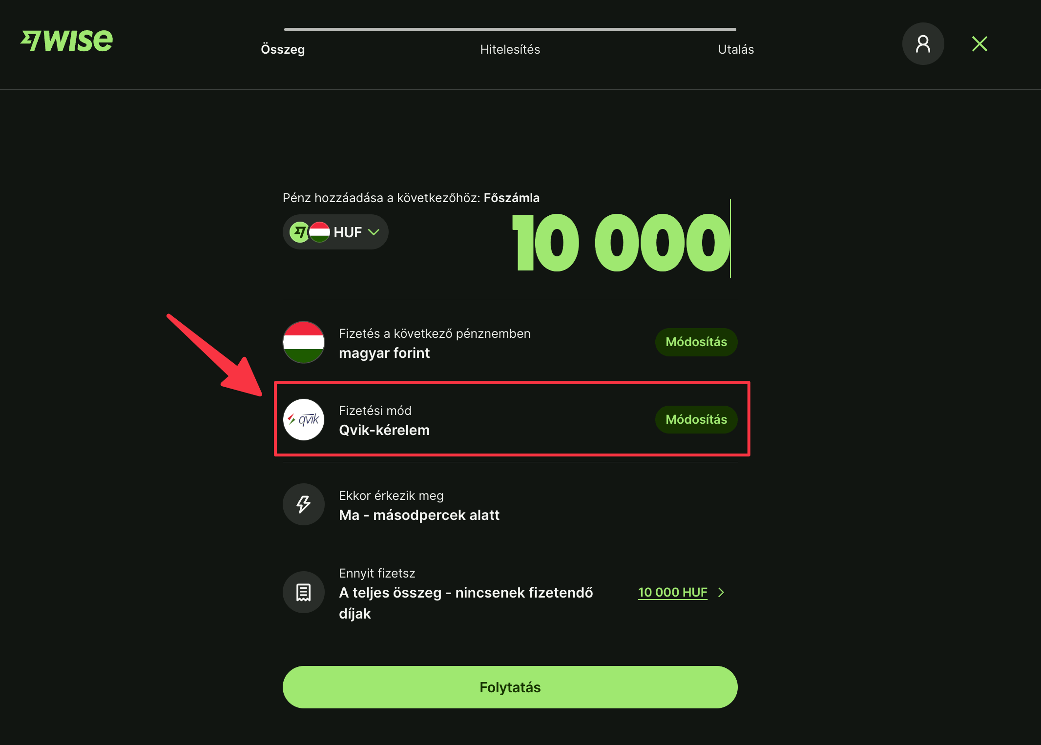Fontos, hogy ez csak a saját Wise egyenleg feltöltésére lehet használni és csak egy másik, saját bankszámláról lehet így pénzt áthozni. Családtag, ismerős és más személy számlájára nem lehet qvik-kérelmet küldeni, onnan nem fogja a Wise engedni a beérkező összeget.