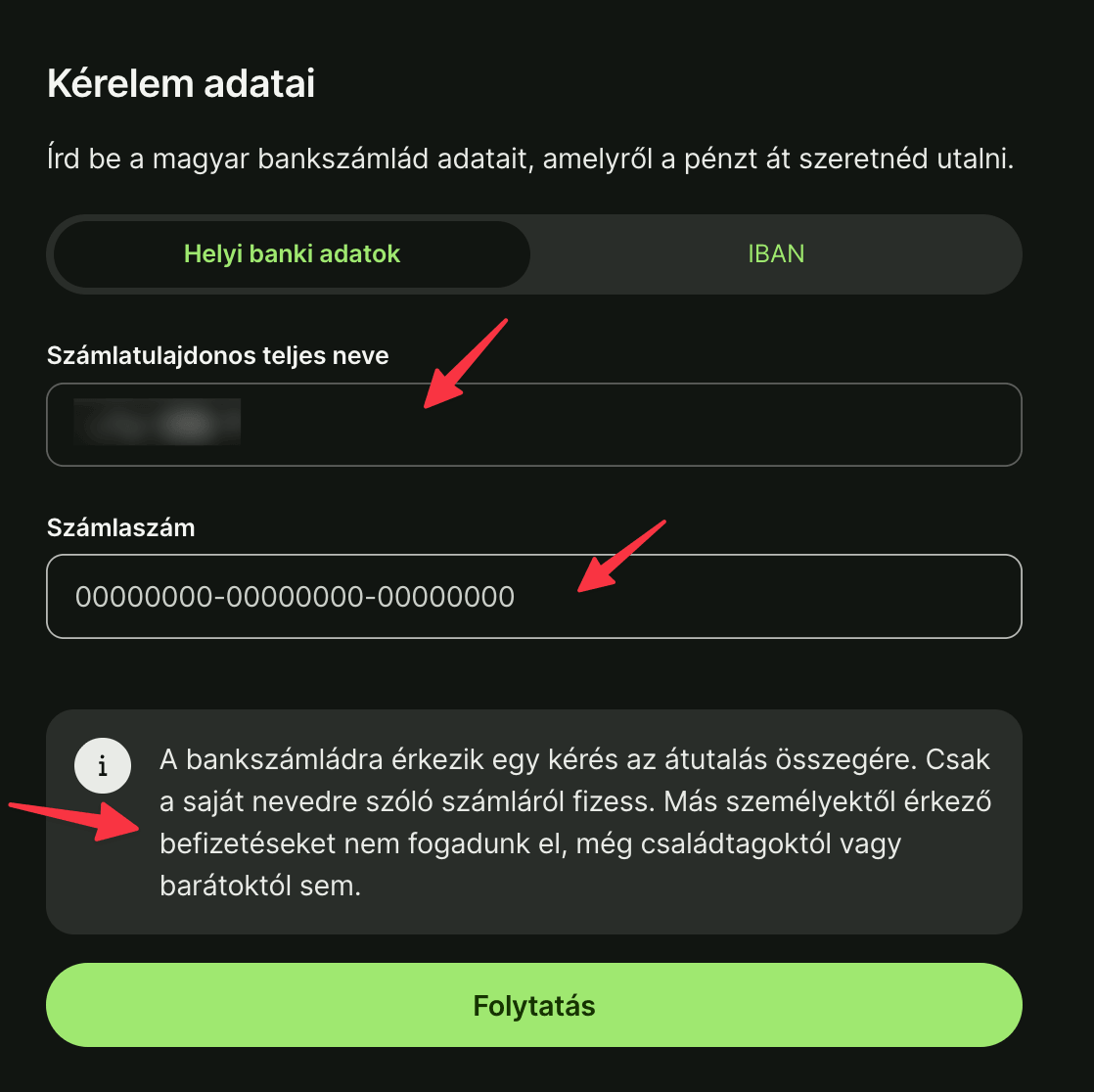Ezután alul a ‘Folytatás’ gombra kell nyomni és utána meg kell csak adnod a másik bankszámlaszámodat, ahonnan majd át szeretnél küldeni az összeget: